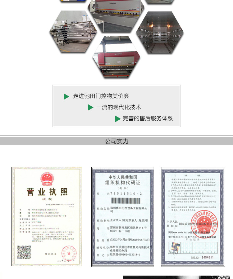 郑州驰田门控设备工程有限公司分销和批发自动门和材质,这些产品在消费市场上很畅销,并且在顾客中保有很高的地位。公司与多家零售商和代理商成立了长期安定的合作关系。郑州驰田门控设备工程有限公司分派的自动门材质齐备,价钱合理。郑州驰田门控设备工程有限公司坚实,可信任,守合约,确保产品质量,具备多种经营特色,薄利多销的规范,获得了客户的信赖。