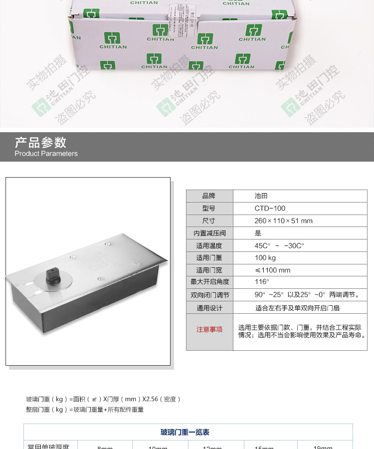 由于蜗轮可以向前和向后转动,因此地弹簧可用于双向打开的门,而闭门器仅适用于沿一个方向打开的门。地弹簧的技术着重是载荷-主轴下部的轴承座,决定了地弹簧的承重等级。因为用于双向开门的地板弹簧必须经受门体的重量,而不是闭门器门体的厚度在地板弹簧的选择中起着决定性的功用。在实际上应用中,门扇的重量一般而言不会过大,因此在地板弹簧型号上选择门宽和风压是首选因素。留意长宽比,即高宽比。如果比重过大,门扇将无法正常工作。