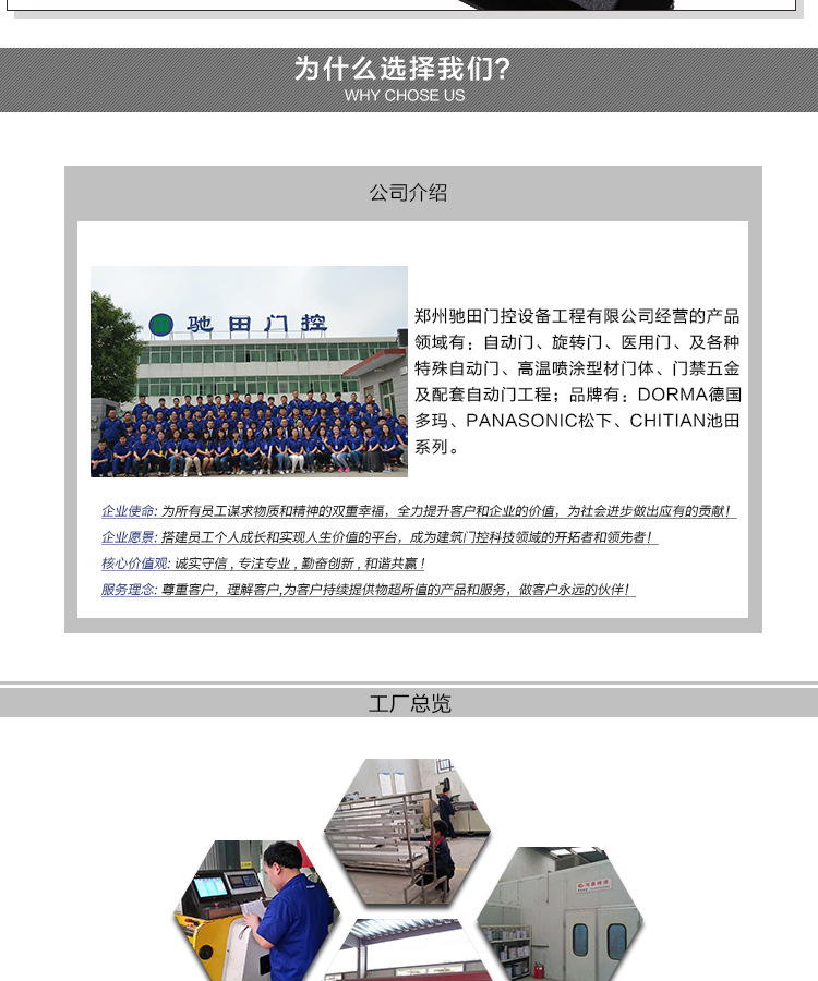 郑州驰田门控设备工程有限公司,德国品牌多玛,日本松下自动门,地弹簧,是闭门器和其他自动门及其配件的授权分销商,并且还持有自己的单独研发品牌池田,业务领域包括:自动门,旋转门,医用门,以及各种特别自动门,高温喷涂型材门体,门禁硬件及配套自动门工程。保有一支高素质的服务团队化解客户在各个方面的疑虑。安装,售后,维修等方面,请选择池田门禁,让您放心,省心,省心!