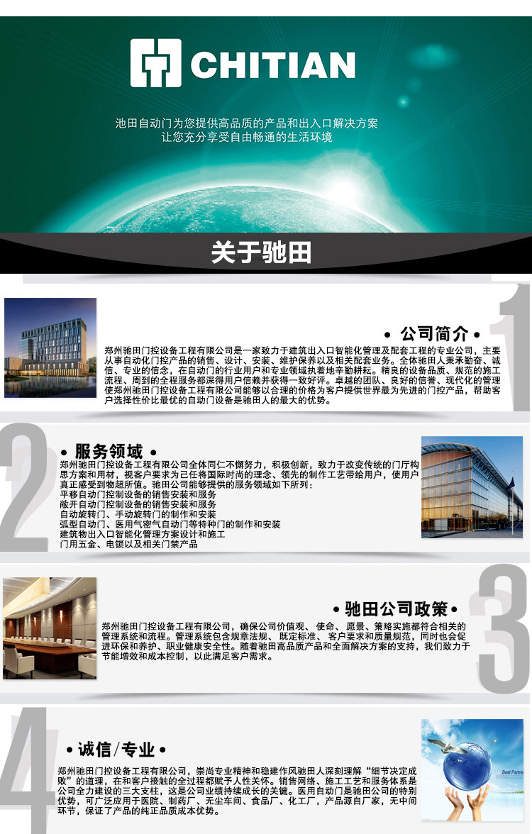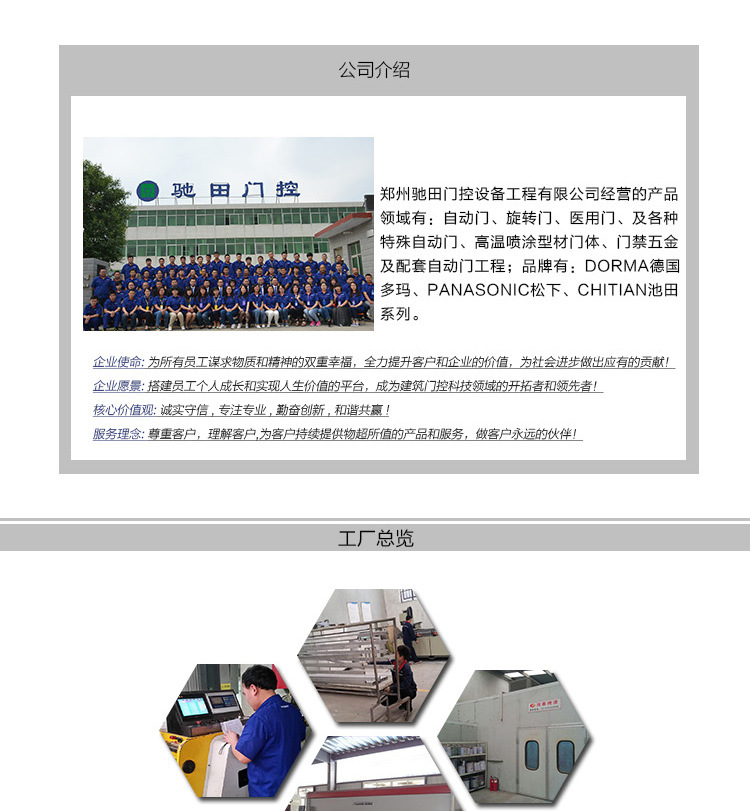 郑州驰田门控设备工程有限公司,德国品牌多玛,日本松下自动门,地弹簧,是闭门器和其他自动门及其配件的授权分销商,并且还保有自己的独立自主研发品牌池田,业务领域包括:自动门,旋转门,医用门,以及各种特别自动门,高温喷涂型材门体,门禁硬件及配套自动门工程。具备一支高素质的服务团队化解客户在各个方面的疑虑。安装,售后,维修等方面,请选取池田门禁,让您放心,省心,省心!