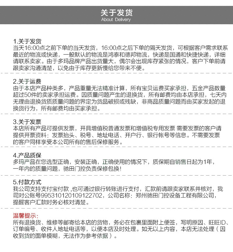 郑州驰田门控设备工程有限公司分销和批发自动门和材质,这些产品在消费市场上很畅销,并且在顾客中保有很高的地位。公司与多家零售商和代理商确立了长期平稳的合作关系。郑州驰田门控设备工程有限公司分派的自动门材质齐备,价格合理。郑州驰田门控设备工程有限公司结实,可信任,守合约,确保产品质量,有着多种经营特性,薄利多销的规范,获得了客户的信赖。
